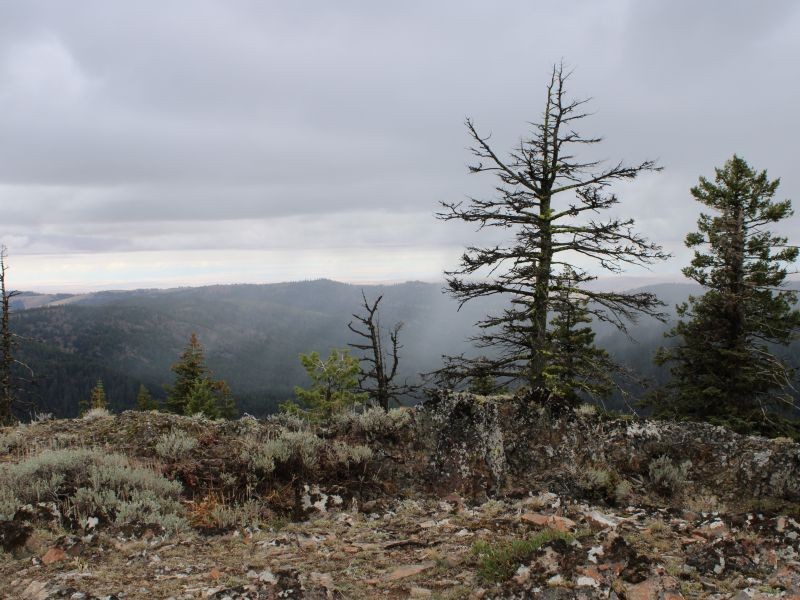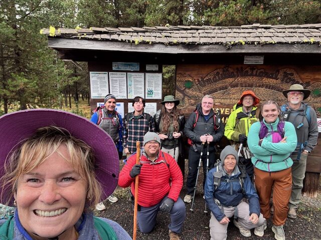 We arrived at the trailhead located at the Coalmine Hill Campground on a cold and overcast morning. We chose to hike the loop in a clockwise direction in the hopes that the elevation gains would be more manageable. On our way to Bald Mtn. summit, it became clear that we were a little early in the season to see the full glory of the larch trees changing color. The process had started but the bright yellow trees were not to seen. We reached the summit just as a light snow fall began, and everyone donned an outer rain gear layer for the trek off the summit. The group made a short side trip to view the Gibson Cave, and then on to the final leg of the loop back at the campground. The hike took a total of about 4.5 hours and was approx. 7.5 miles. Group picture courtesy Cat Johnson Summit and hiker pictures courtesy Marie Mortensen