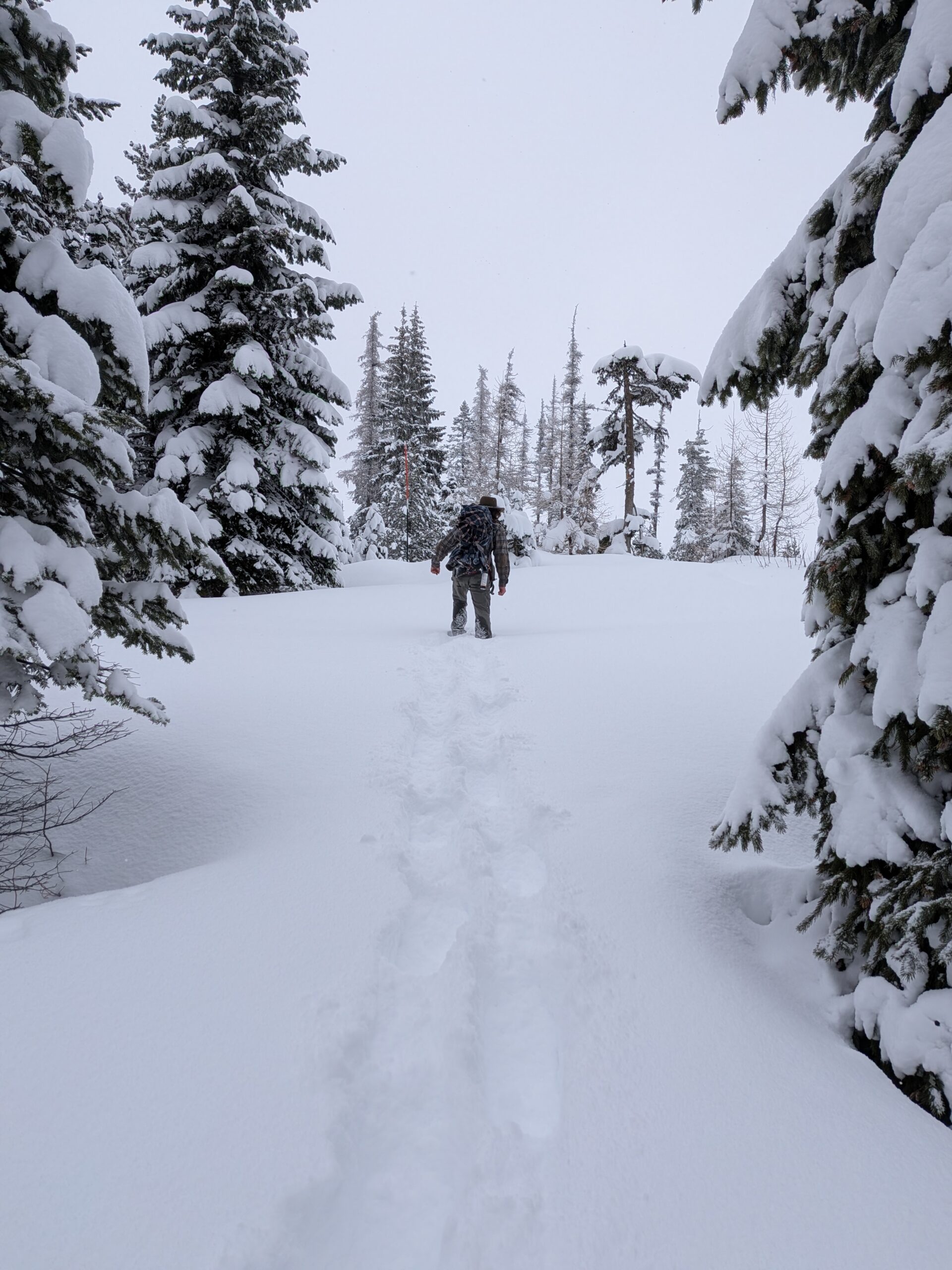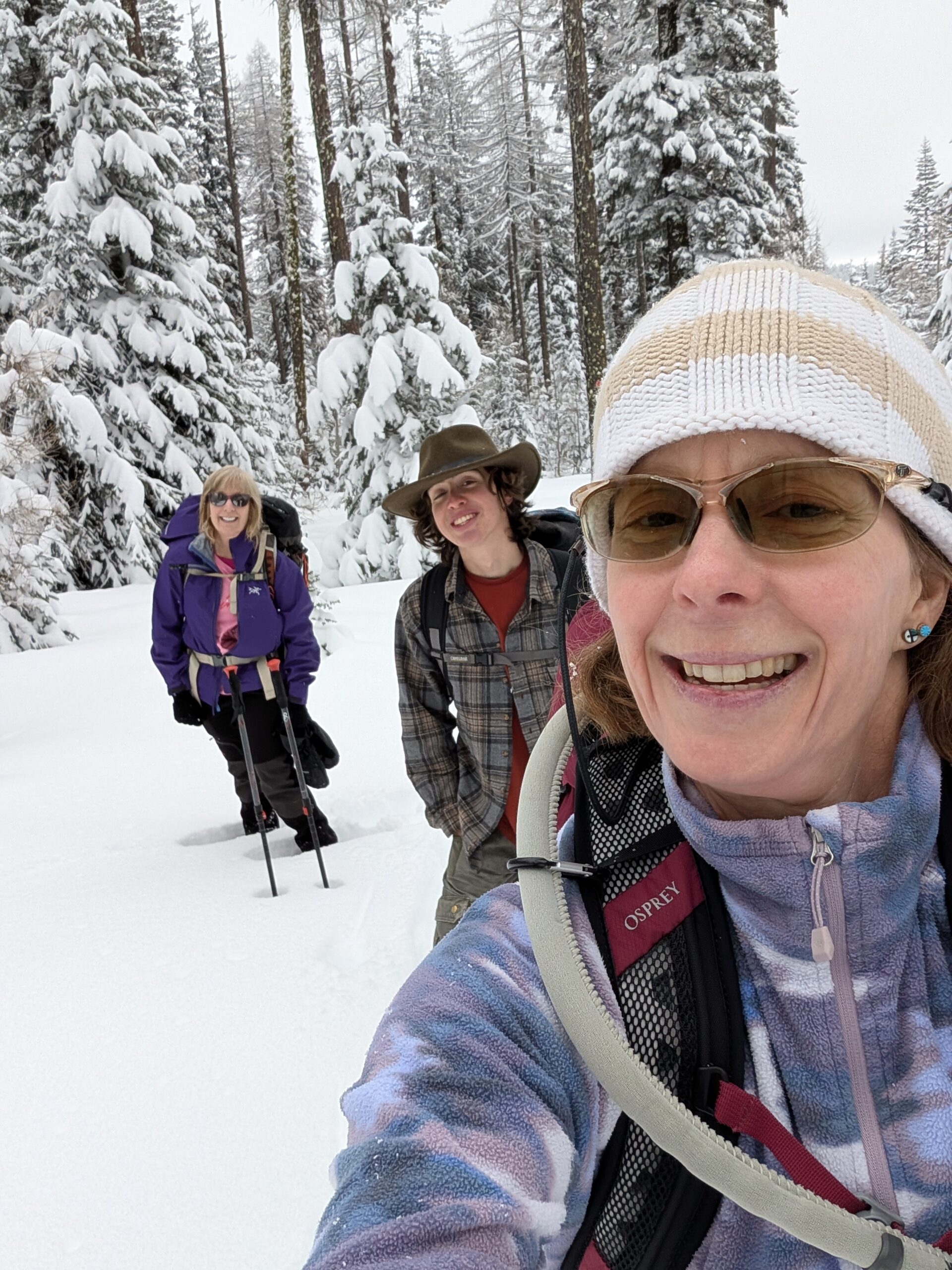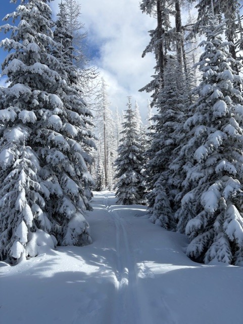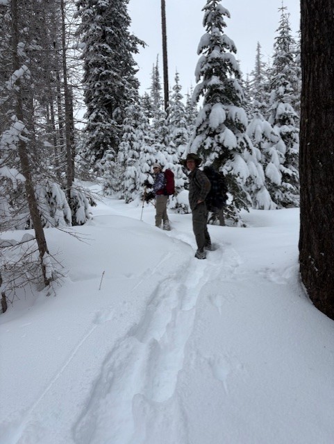This event was originally scheduled to take place along Blewett Pass, but there was only an inch of snow on the ground there. We made a last minute decision to change our destination to Horseshoe Prairie which had just received 7 inches of new snow. We wanted to snowshoe! The temperature when we arrived was a balmy 19 degrees F but we were prepared for the cold. The new snow was light powder and we broke trail on several of the snowshoe-only trails: Pine Marten, Snowy Owl, Twist and Shout as well as parts of multi-use trails Wagon Wheel and Prairie Loop. We saw a few small groups of XC skiers about halfway through our wanderings but no other snowshoers. We had lunch in the warming hut. We snowshoed 4.5 miles and 500 feet elevation gain. A map of the trails at Horseshoe Prairie can be found here: https://bmlt.org/horseshoe-prairie